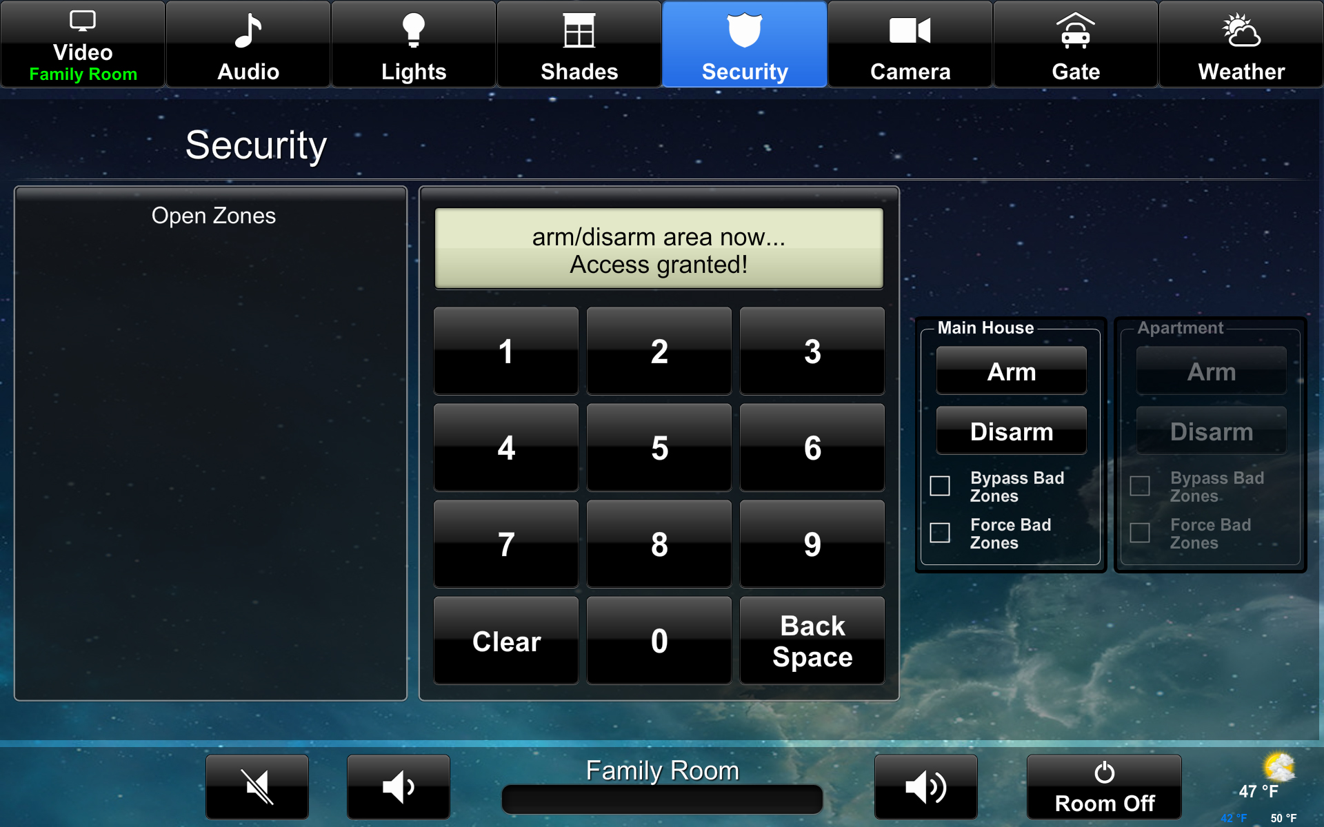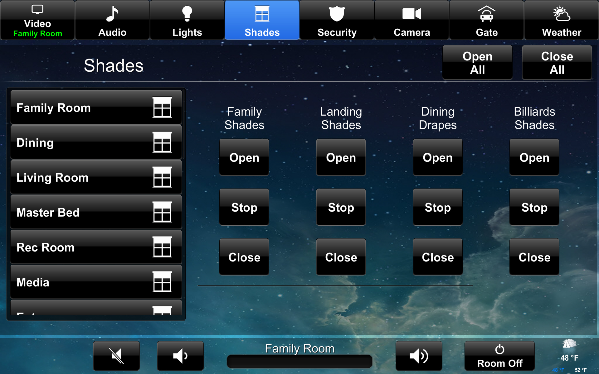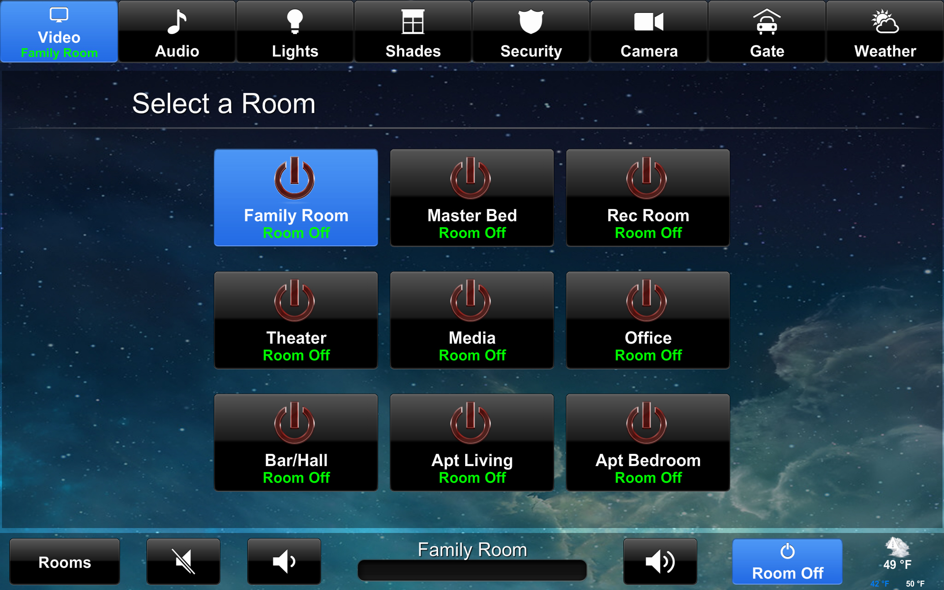 Pressing the Rooms button on bottom left allows you to select the room you want to control.